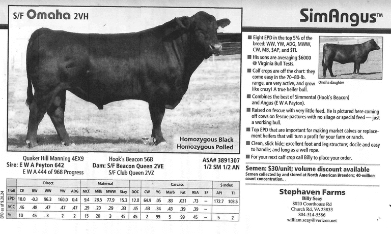 BUYER RESPONSIBLE FOR SHIPPING. Semen is located at North American Breeders in Berryville, VA. Contact Billy Seay at 804-514-5586.